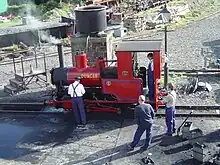 After being handed over to the RAF on 21 February 1918 the engine was first used at Manston by the Admiralty Air Construction Service.[2] From October 1921 onwards Douglas spent most of its working life at RAF Calshot near Southampton.[2] In April 1949 it was sold at auction and bought for £60 by an engineering company called Abelson & Co (Engineers) Ltd.[2] In the early days of preservation, the Talyllyn Railway had contacted this and other similar firms, asking for redundant equipment. Abelson's offered the locomotive to the Talyllyn, and in return they named it after the donor, Douglas Abelson.[3] After presentation in 1953 the locomotive was retubed and converted from 2ft gauge at Griffin Foundry, Oldbury (with the conversion being paid for by Abelson) before being taken by road to Tywyn.[4][2] At the same time as the conversion the engine's buffers were changed from a single centred buffer at each end to pairs of buffers.[5] The cab was also extended backwards by about 6 inches to allow the engine's lever brake to be replaced by a screw brake.[5]