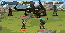 Players were encouraged to recruit characters into their party during combat.[2] The bottom of the screen contains a list of potential characters who can be recruited by the player: some were non-player characters generated within the game, while others were avatar characters of the player's friends on Facebook.[2] At the conclusion of the battle, players must wait a certain amount of time before characters who had just participated in battle could be carried over into the next one.[2] To circumvent the limitations on waiting time, players were able to spend money to purchase in-game currency called "Crowns"; in the alternative, the player had the option to invite more Facebook friends to play Legends together.[2] Unlike standard multiplayer games, there was no element of playing together: displayed avatar characters who represent the player's Facebook friends were not actually player-controlled, but simply have their statistics and personas imported into the player's game.[3][2] Players can compose a party of up to six characters, though the actual number of characters which could be recruited at any given time was dependent on the individual player's level of advancement.[2]