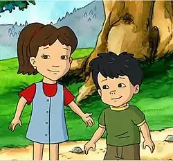 Protagonists Emmy and Max (top image) in a season 2 episode of Dragon Tales, "Lucky Stone" (2001). Ord, Enrique, Max, Emmy, Zak and Wheezie, and Cassie in a season 3 episode (bottom image) of Dragon Tales, "Rise and Bloom" (2005).