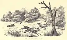 10. f.21 '9. View of the boundary ridge dividing the Pulnis' 'from Travancore. Englishmen shooting bison in foreground.