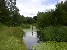 Much of Drinkwater Park is very flat as it is on the flood-plain of the River Irwell but the valley rises steeply to the east in the area known as Carr Clough. There is a long narrow reservoir running up the centre of the park which, on the 1894 map, appears to have been used as a water supply for the Clough Bleach and Dye Works,[2] although the narrow northern arm has long since been culverted. Most of the land in the park was very open and windswept until the early 1990s, as can be seen on the 1982 photograph by John Davies.[3] Since that time there has been a programme of tree planting carried out as part of the Red Rose Forest Scheme.[4] Most of the park, apart from the football playing fields, is now thickly wooded with a diverse selection of broadleaved trees.