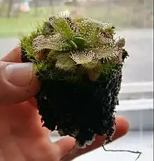 A transplant of a medium-sized D. admirabilis. Note the long roots, as well as its outer leaf tentacles.