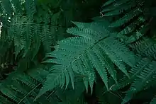 The leaf itself rather thick in texture but not evergreen. It may range from dark green to golden green color. The leaves may be 35–120 cm in length and 15–40 cm in width depending on the specimen.[3] The base of the leaf is not strongly tapering and the bottom leaflets are only slightly smaller than the leaflets directly above them. The tip of the leaf is rather short or abruptly tapering which is a distinctive characteristic to help distinguish this fern from similar species. The tip of the leaf may also be white mottled in some specimens.[3] The leaf is broken up into many pairs of leaflets which are mostly pinnate but some at the bottom of the leaf may be bipinnately divided. The leaflets are typically tapering at both the base and the tip and have a short stem connecting them to the main stem. The leaflets are themselves divided into many subleaflets which are oblong or elliptic in shape with a pointed tip and a toothed edge. They are generally curved such that the tip of the leaflets points toward the tip of the leaflet.