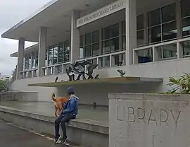 The Du Pen Fountain is a water fountain at the former Washington State Library building on the Washington State Capitol campus in Olympia, Washington, in the United States. The sculptor, Everett Du Pen (1912–2005),[1] was well known in the Northwest, and chairman of the Sculpture Department at the University of Washington when he was commissioned for the piece in 1955. The fountain is made of 900 pounds (410 kg) of copper-enriched bronze, green terrazzo, and cement.[2][3] An element of the fountain is a pair of salmon spitting water. The fountain, along with the nearby and much larger Tivoli Fountain replica, is shut down by the state property administration agency during summer droughts.[4][5] The artist also created the Fountain of Creation at the Seattle Center for the 1962 World's Fair.[6] The Seattle fountain is also nicknamed Du Pen (or DuPen) Fountain.[7]