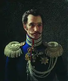 Leontiy Vasilievich Dubbelt (also transliterated as Dubelt, Russian: Леонтий Васильевич Дубельт) (1792–1862) was a Russian soldier (1807-1828) and subsequently a police-chief under Emperor Nicholas I (r.1825–1855). Dubelt fought against the Grande Armée at the Battle of Borodino in 1812 and briefly came under suspicion of involvement in the Decembrist conspiracy of 1825. Colonel Dubelt resigned from the Imperial Russian Army in 1828 and joined the Corps of Gendarmes[1] - the Russian Empire's uniformed security police. He held senior rank from 1839 to 1856 in the feared Third Section and largely specialised in censorship.[2] In the course of his career he took part in secret-service cases involving writers and intellectuals[3] such as Pushkin (posthumously investigated in 1837[4]), Lermontov (banished to the Caucasus in 1837[5]), Saltykov-Shchedrin (arrested and exiled in 1848[6]) and Turgenev (arrested and exiled in 1852).