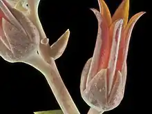 The peduncle is 15 to 95 cm tall, and is 3 to 12 mm wide. The lower internodes are spaced over 5 mm from each other. There are 18 to 40 bracts, spreading to ascending, and shaped triangular-lanceolate to ovate. The cyme is branched 2 to 3 times, and the next branches may bifurcate. The terminal branches are 2 to 25 cm long, and have 2 to 20 flowers on spreading pedicels. The pedicels are 2 to 12 mm long, becoming erect, and are red or green, and not generally pink. The sepals are 3 to 6 mm large, shaped deltate-ovate. The petals are 10 to 16 mm long, 3.5 to 5 mm wide, shaped elliptic to oblanceolate and fused connately 1 to 2 mm.[3][4] The petals are usually red or orange, and more uncommonly bright yellow to purplish-red, and very rarely green.[5]