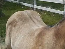 • Transverse stripe, a crosswise stripe along the shoulders perpendicular to the dorsal stripe, very common in donkeys, less common in horses, and if present, often faint, usually only visible on a short summer coat, if at all.[1]