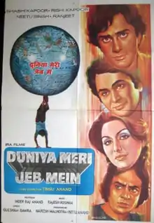 Duniya Meri Jeb Mein (transl.The world in my pocket) is a 1979 Indian Hindi-language action film directed by Tinnu Anand, stars Shashi Kapoor, Rishi Kapoor, Neetu Singh in pivotal roles and music was composed by Rajesh Roshan.