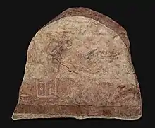 Only the baptistry was decorated with wall paintings, which distinguished the church from the nearby Jewish synagogue that featured artwork on display throughout. Scholars hypothesize that this difference stems from Christianity's desire to promote conversion at the time, which would only happen within the baptistry and give the convert the singular experience of witnessing the artworks when they were anointed.[35] The room's ceiling could be reconstructed using plaster fragments; it was painted in dark blue with bright stars.[36] The baptismal font was on the west side of the room, where there were a brick canopy with a vaulted ceiling and two pillars in the front. The pillars were painted dark green with black veins, probably to imitate marble. The front over the arch of the niche showed fruits in fields. The ceiling inside the niche was blue with bright stars.[37] Inside the niche was the baptismal pool. There are paintings on the back wall; the Good Shepherd was on the left[38] with a ram on his shoulders. The figure was about 40 cm (16 in) high. A flock of sheep was depicted in front of him, in the middle of the field and on the right. The number of sheep and rams cannot be determined today; it was probably once between thirteen and sixteen. The sheep on the far right are drinking water, although this part of the scene was in poor condition. The large number of sheep was atypical for comparable presentations. Under the Shepherd are Adam and Eve; both figures appearing to be a later addition. The whole picture was found to be poorly preserved and was found in fragments that had to be reassembled. It is uncertain whether the number of sheep had a symbolic meaning. The representation of the Good Shepherd was extremely popular in ancient times; it is always a picture of a young, beardless man in a short skirt carrying a sheep on his back.[39]