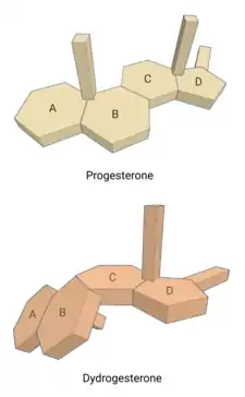 - ↑ Colombo D, Ferraboschi P, Prestileo P, Toma L (January 2006). "A comparative molecular modeling study of dydrogesterone with other progestational agents through theoretical calculations and nuclear magnetic resonance spectroscopy". The Journal of Steroid Biochemistry and Molecular Biology. 98 (1): 56–62. doi:10.1016/j.jsbmb.2005.07.009. PMID 16216490. S2CID 35936384.