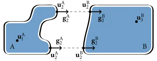 Consider two substructures A and B as depicted in the figure. The two substructures comprise a total of six nodes; the displacements of the nodes are described by a set of Degrees of Freedom (DoFs). The DoFs of the six nodes are partitioned as follows: