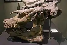 Skeletal mount (left) of Paraceratherium lepdium, which is possibly a synonym of D. turfanense, Turpan Museum
