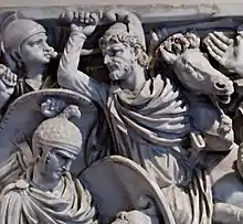 Historical descriptions of the warfare of the Germanic peoples depend entirely on Greco-Roman sources, and this is the aspect of Germanic society that Greco-Roman sources discuss the most.[6] Besides Julius Caesar's Bellum Gallicum (1st century BCE), there are two accounts that might apply to the Germanic peoples in general: chapter 6 of Tacitus's Germania (c. 100 CE) and book 11 of the Strategikon of Maurice (6th century CE).[7] However, the accuracy of these depictions has been questioned, and it is impossible to show archaeologically how the Germani fought.[5] Archaeology has yielded large amounts of Germanic weaponry, giving at a sense of their equipment.[8]