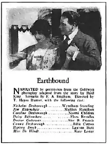 Earthbound is an American silent drama film from Goldwyn Pictures Corporation that was released on August 11, 1920. The film was written by Edfrid A. Bingham from a story by Basil King, and directed by T. Hayes Hunter. Earthbound was produced by Basil King with cinematography by André Barlatier, film editing by J.G. Hawks and art direction from Cedric Gibbons.[1]