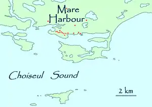 Mare Harbour, known colloquially as East Cove Port, is a small settlement on East Falkland, on Choiseul Sound. It is mostly used as a port facility and depot for RAF Mount Pleasant,[1] as well as a deepwater port used by the Royal Navy ships patrolling the South Atlantic and Antarctica, which means that the main harbour of the islands, Stanley Harbour tends to deal with commercial transport.