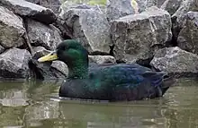 The East Indie is the oldest breed of bantam duck.[6] It is thought to have originated in the United States, but its precise origin is not known.[7] It has at various times been known by other names, some of them – such as "Brazilian", "Buenos Airean", "Labrador" – suggesting a geographical origin. There is, however, no documented connection to the East Indies, to South America, or to Labrador.[8]:38[7] It is thought that the breed developed from its original form in the United Kingdom in the second half of the nineteenth century, and was then further refined in the United States in the latter part of the twentieth century.[8]:38 A hypothesis that the black color of the plumage derives from the native American species Anas rubripes appears to be unsubstantiated.[8]:38