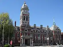The council meets at the Town Hall on Grove Road. The building was designed by William Tadman Foulkes, and built between 1884 and 1886 under supervision of Henry Currey, the Duke of Devonshire's architect.[18]