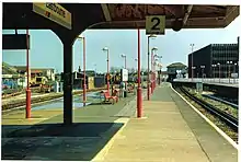 In 1872, due to the increase in services serving Eastbourne, which had become a popular resort, the station was relocated a little to the east under the supervision of LB&SCR Chief Engineer Frederick Banister. In 1886 the station was rebuilt to designs by F.D. Brick.[3] The rebuilt structure featured a vaulted canopy and lantern roof, similar to that of Lewes. It originally had four platforms, which increased in length over the years. Between platforms 2 and 3, there were also two run-around loops. However, over time, one of these loops was lost as platforms 1 and 2 were expanded. On 12 April 1977, platform 4 was shortened from a 12-coach to an 8-coach length to accommodate the ring road construction.[5] It was later taken out of use and the track was lifted during the Eastbourne re-signalling in 1991.