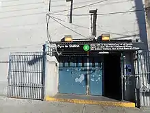 The station's only station house is on ground level with doors to the east side of Dyre Avenue on the northeast corner of Light Street. It has a token booth, turnstile bank, and two staircases to the platform.[16]
