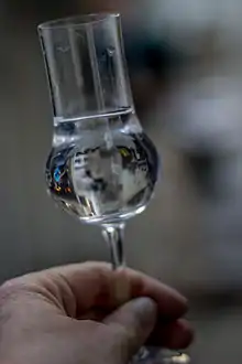 An eau de vie[upper-alpha 1] (French for spirit,[1] lit. 'water of life') is a clear, colourless fruit brandy that is produced by means of fermentation and double distillation. The fruit flavor is typically very light.