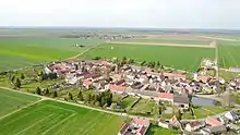 The farmsteads with forward-facing gables and with partly elaborate gates or portals have repeatedly been renovated on a persistent ground plan dating from the High Middle Ages; their building fabric today dates from the 17th to 20th century. The belt of barns terminating the farmsteads has been completely preserved. Around the gardens and meadows adjoining each barn, a path that can be accessed from each farmstead still marks the original village boundary today.[5] The churchyard is located on the north-eastern edge of the village and is surrounded by a lane. From the church that existed in the High Middle Ages, a high choir tower with a wall bond of opus spicatum and coupled abat-sons remains. A Baroque hall church was adjoined to this tower on the eastern side in the 18th century.[6][7]