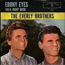 "Ebony Eyes" is a song written by John D. Loudermilk, recorded in 1961 by The Everly Brothers, and released as a single together with "Walk Right Back", which reached No. 8 on the U.S. Billboard Hot 100.[1] The lyrics tell a young man's tragic story of losing his beloved fiancée in an airplane crash in dark, stormy weather conditions, which remind him of his fiancée's "ebony eyes".