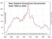 New Zealand Prime Minister Sir Robert Muldoon was the face behind the Think Big strategy that was implemented during his time at the head of the National party. This strategy was devised to establish 400,000 jobs, following the second oil shock in 1979, and push New Zealand toward being self-sufficient in the energy sector. Massive industrial plants were built on New Zealand's natural gas reserves and a wide variety of new products for export such as ammonia, urea fertilizer, methanol, and petrol were produced.[9] However, bad timing struck and many of these projects were available for use right as oil prices hit the ground, dropping from US$90 a barrel to US$30 a barrel within a few years. Due to these Think Big projects requiring capital to get started, the public debt shot through the roof from NZ$4.2 billion to a staggering NZ$21.9 billion 9 years later when Muldoon left the position of Prime Minister. It has been speculated that these debts have cost taxpayers over NZ$7 billion since the early 1980s.[19]