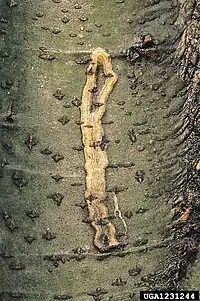 The larvae feed on various Fagus and Quercus species. Unlike most other Nepticulidae species, the larvae mine the bark of their host, rather than the leaves. The mine consists of a contorted gallery in bark of trunks or thick branches. The larva feeds mainly in the direction of the main axis. It is especially abundant on the sunny side of trees.