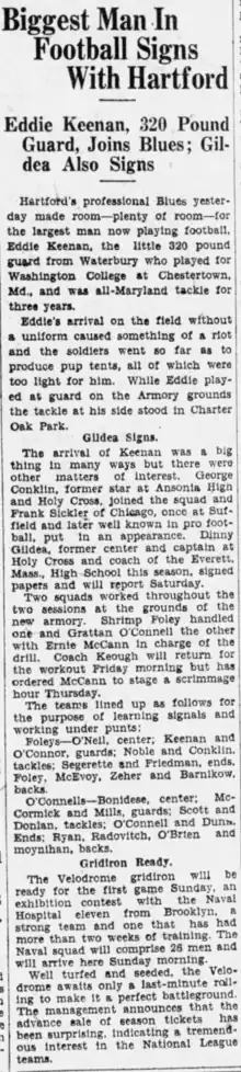 Keenan was officially signed by the Blues on September 14, and an article in the Hartford Courant wrote afterwards, "Hartford's professional Blues yesterday made room–plenty of room–for the largest man now playing football, Eddie Keenan the little 320 pound guard from Waterbury ... Eddie's arrival on the field without a uniform caused something of a riot and the soldiers went so far as to produce pup tents, all of which were too light for him ... The arrival of Keenan was a big thing in many ways."[1]