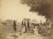 In December 1864, William T. Sherman had successfully captured Savannah in his March to the Sea. During his campaign, a large number of slaves had fled and followed behind Sherman's Army. General Rufus Saxton, who had been a quartermaster under Thomas Sherman at Hilton Head in charge of contraband on various islands, including at Edisto, in 1862, recommended St. Simons Island in Georgia and Edisto Island as good locations for new colonies, as both had previously held colonies but were relatively free of rebels.[27] At the end of the war, Saxton was made Inspector of Settlements and Plantations. Under his supervision, many former refugees returned to Edisto.[28] In 1865, the Freedmen's Bureau was supervising the colony on Edisto. Former plantations, such as the William Seabrook plantation were used as camps and Crawford's Plantation House owned by Confederate officer, William J. Whaley, was used to house Freedmen's Bureau teachers Mary Ames and Emily Bliss.[29]