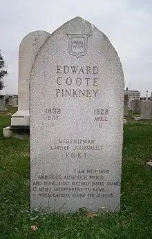 Suffering from depression, Pinkney died of tuberculosis on April 11, 1828, at the age of 25.[9] He was buried in Baltimore's Unitarian Cemetery. In May 1872, his body was moved to Green Mount Cemetery, also in Baltimore.[10]