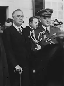 Watson would continue this pattern of service until becoming Senior Military Aide to the newly-inaugurated President Franklin D. Roosevelt in 1933.[8] He was promoted to colonel on May 1, 1937, brigadier general on April 1, 1939, and major general on October 3, 1940.[6] Watson helped Roosevelt navigate the bureaucracy of the War Department and the Army, especially during the crucial years prior to America's entry into the Second World War. He was also appointed the President's Appointments secretary in 1938 after the illness of the previous secretary, Marvin H. McIntyre, prevented him from continuing with his duties,[8] managing access to the President and dictating the tenor of his daily schedule.