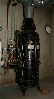 On January 22, 1897, Ruud filed a patent separate from the Fuel Gas and Manufacturing Company for an Automatic Water Heater. His new design consisted of a cast iron shell, enclosing burners, heating surfaces (a coil of copper tubing through which water flows), and thermostat controlling gas-valves.[17] The object of the design improvement was, "to maintain the supply of water at the desired temperature at all times."[18]