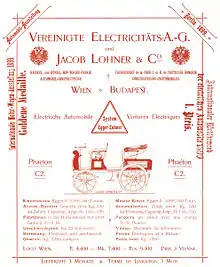 Near the end of the 19th century, Ludwig Lohner, the owner of the Austrian carriage maker Jacob Lohner, travelled in Europe and the United States. He became convinced that the age of horse and carriage was over and that his company should start building automobiles. In 1898 Lohner experimented with self-propelled carriages. A joint venture of Vereinigte Electricitäts A.G. and Lohner built a phaeton car. It had an electric drive train that was designed by Ferdinand Porsche. On September 28, 1899, Porsche drove a C.2 that was entered in the Berlin road race, where it won the gold medal and crossed the finish line 18 minutes before the second car. It also came out on top in the efficiency test, where it was recorded as the lowest energy consumption vehicle in urban traffic.[1]
