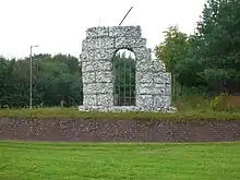 The curtain walls of the Walled Kitchen Garden with two roofless Gazebos or temples survive. One was used as a resting parlour and the other was an aviary.[27] They were both topped with statues as shown in surviving photographs. A handsome gate of cast-iron stood at the end of the bridge and its pilasters had two of the four statues representing the four seasons, the other two being on the temples.[27][38] Loudon in 1824 comments the trees of the park are large, of picturesque form and much admired. The kitchen garden is one of the best in the country. The park trees were mainly beech, with oak and elm also present. An article in 1833 in the Gardeners' Magazine makes similar remarks and comments on the ... many hundred feet of hot houses; however, it also notes that the ... grounds are not kept up as they ought to be.[39] A hedge maze or labyrinth existed in the grounds up until the 1920s.[25]