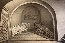 Around 1563 Lamoral had a burial crypt built underneath the church of Zottegem for his grandfather and mother. The remains of Lamoral himself were added to that crypt in 1568 after he was beheaded on Brussels' Grand-Place/Grote Markt. His wife Sabina, Duchess of Bavaria († 1578) and his sons Philip († 1590) and Charles († 1620) were also buried there. The crypt was used until the 17th century after which it fell into oblivion. In 1804 the graves were rediscovered by chance.[2] They were transferred in 1857 to a newly built crypt, which was restored in 1952.[3] The leaden coffins were enveloped in bronze sarcophagi. In 1954 the remains underwent a conservation treatment.[4][5] In 2016 a glass dome was added to the crypt.[6][7][8][9] In 2017 new genetic research brought to the fore that Egmont's remains had not been damaged by the Spaniards directly after his beheading, but many centuries later.[10][11][12][13][14]