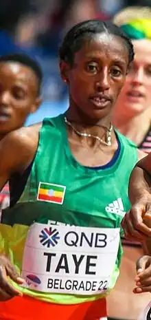 Ejgayehu Taye (born 10 February 2000)[1] is an Ethiopian Olympic long-distance runner. She won the bronze medal for the 3000 metres at the 2022 World Indoor Championships. Taye is the current world record holder in the 5 km road race.