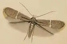 The wingspan is 9–11 millimetres (0.35–0.43 in). Adults are pale grey with a whitish head and a white transverse line across the center of the forewing. They are on wing from May to July and again in August in two generations per year.[2]
