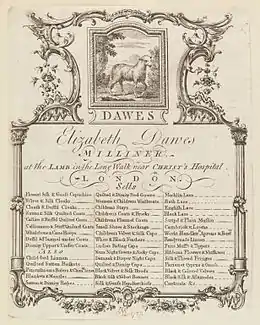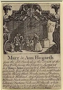 In the eighteenth century, millinery was considered a respectable trade for middle-class women and impoverished upper-class women - women who would not want to lower themselves by becoming domestic servants or performing actual labor. Far from putting their daughters in trade because they were unmarriable, Amy Erickson suggests that parents apprenticed their daughters in order to provide them with a reasonable living when the family did not have the money for a dowry and also to gain skills that might attract a husband and sustain them throughout their lives.[30] Mary and Ann Hogarth, sisters of the artist William Hogarth, contemporaries of Mosley, never married and supported themselves through their own millinery shop.[31] One of their business cards was designed by their brother.