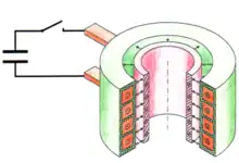 When the switch is closed, electrical energy stored in the capacitor bank (left) is discharged through the forming coil (orange) producing a rapidly changing magnetic field which induces a current to flow in the metallic workpiece (pink). The current flowing the workpiece produces a corresponding opposite magnetic field which rapidly repels the workpiece from the forming coil, reshaping the workpiece — in this case, compressing the diameter of the cylindrical tube. The reciprocal forces acting against the forming coil are resisted by the 'supportive coil casing (green).