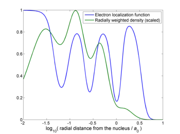 Electron localization function of the krypton atom at the Hartree–Fock / cc-pV5Z level of theory. Also shown is the radial density, 4πr2ρ(r), scaled by a factor of 0.0375.
