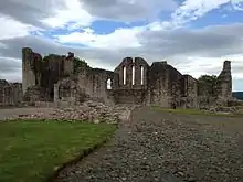 When King Robert died 18 months later, his body was laid to rest next to Elizabeth, who had been interred in the very centre of the abbey beneath the high altar, in an alabaster tomb decorated with gold leaf.[17] Fragments of the tomb still remain and can be seen in the National Museum of Scotland.[18] The abbey was sacked in 1560 by Calvinists during the Scottish Reformation and the tomb was lost. However, King Robert's coffin was rediscovered in 1819 during construction work on the new abbey and Elizabeth's coffin was rediscovered in 1917. Both were re-interred in the new abbey.