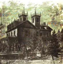 After her husband's death in Parsons in 1885,[4] the widow moved to her farm at Wilsonton, Kansas. She erected a large house, built in plain view of the trains passing on the Katy.[7] In her elegant home, she had one of the finest private libraries in the state. Her walls were covered with the choicest paintings and works of art, while every available space was filled with statuary of the old masters and patriots of the world.[5]