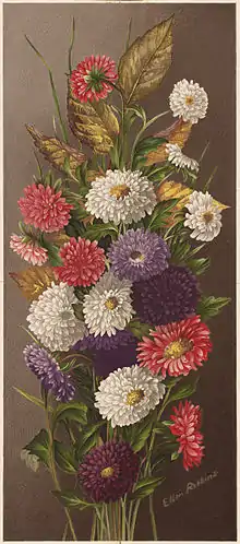In her twenties, Robbins began producing books of flower illustrations and selling them for the then very substantial sum of $25 each. Her success with these led her to broaden out from flowers to autumn leaves.[2] She was known for work so realistic that, as one contemporary wrote, bees might light on her flowers. Similarly, her leaf paintings are still occasionally mistaken for real leaves by viewers.[2] The art historian Samuel Benjamin considered her "one of the finest still life painters in America."[4][5] Another art historian, however, has compared the "harsh edges and forthright local color"[6] of Robbins's flower paintings unfavorably to the work of Childe Hassam, yet those are precisely the qualities that her fans admire.
