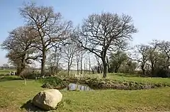 The hamlet is clustered around Ellerton Hall, an early 19th-century manor built on the site of an earlier house.[2] Next to the road is a large millpond fed by the Goldstone Brook, with a derelict waterwheel. King Charles I was supposed to have drunk from a well here, later known as the King's Well.[3] The well is still located by the side of a lane to the east of Ellerton hamlet, near the Kingswell Cottages.