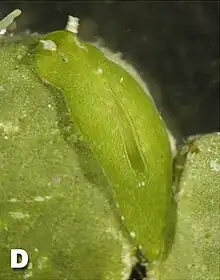 The reproduction method poecilogony,[15] an intraspecific reproduction method in which there are two different forms of larvae modes, is quite rare in the animal kingdom.[16] The different egg sizes, or egg dimorphism, are able to produce two kinds of larvae: planktotrophic and lecithotrophic larvae.[17] Lecithotroph, meaning “feeding on yolk” refers to the larvae relying on the yolk sac produced by the mother as they are not able to feed.[18] Planktophic larvae are larvae that must feed on plankton in order to grow and develop.[18] There are only thirteen cases of poecilogony reported in marine organisms, with seven in spionid polychaetes and six in gastropods- five sacoglossan gastropods and littorinimorph gastropod.[19] Elysia pusilla may be the sixth organism in the order sacoglossans to be capable of this. In Elysia pusilla and Elysia zuleicae, the planktotrophic larvae are more common, but some still produce the lecithotrophic larvae.[20] The smaller size of the lecithotrophic larvae in sacoglossans in comparison to other heterobranchs may allow for developmental plasticity in response to the environment. The frequency of the size difference among the eggs allows sacoglossans to get around the one mode reproductive methods.[20]