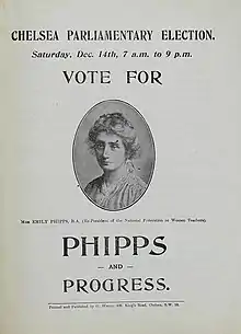 The 1918 general election was the first in which women could both vote in parliamentary elections and stand as candidates, and Emily Phipps was one of the 17 women who took the opportunity to stand, becoming Independent Progressive candidate for Chelsea constituency with the backing of the NUWT. All the women candidates were heavily defeated, but she retained her deposit in a straight contest (with a low turnout) with the sitting Conservative MP, Sir Samuel Hoare.[5]