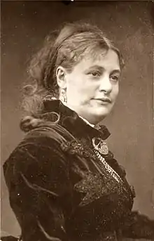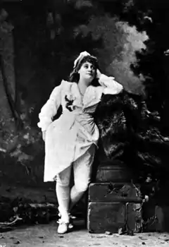 As English-language versions of French opéra bouffe first arrived in Britain, Soldene soon became the leading proponent of Jacques Offenbach and Hervé, combining her comedic and vocal talents.[1] According to The Times, "Soldene was a fine and a highly-trained Singer. Exeter Hall loved her in oratorio no less than the Canterbury, the Oxford or the Alhambra [loved her] in more worldly work; but it was in opéra-bouffe that her voice, her vivacity, and her magnetism first found their perfect material."[3] She created the title role in The Grand Duchess of Gerolstein in 1867 for the touring company of the Royal Opera House, Covent Garden.[4][5] In 1870, at the Lyceum Theatre, she played Marguerite in Little Faust (Le petit Faust) and took over title role in Chilpéric.[6] The next year, she toured as Chilpéric in the provinces.[7] For Charles Morton, in 1871 at the Islington Philharmonic, she first appeared as Drogan in the long-running production of Geneviève de Brabant (also directing the production), which became her favourite role.[8] Now widely popular, she starred at the Gaiety Theatre, London in 1872 in another production of Geneviève de Brabant and as Mlle. Lange in La fille de Madame Angot in 1873.[3] Soldene was also, for several years, a principal boy in British Christmas pantomimes.[9]