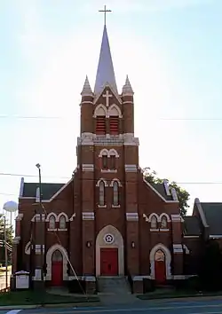 Emmanuel Lutheran Church is a historic Lutheran church building located at 216 S. Aspen Street in Lincolnton, Lincoln County, North Carolina. It was built in 1919, and is a rectangular Late Gothic Revival style brick church with a four-stage central tower with a conical steeple. It features pale beige terra cotta, cast stone, granite, and poured cement detailing; lancet arched door and window openings; and stepped buttresses.[2]
