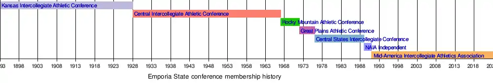 Emporia State University began its athletic life as a member of the Kansas Intercollegiate Athletic Conference (KIAC) from 1893 to 1928.[12] Emporia State, along with other schools from the conference, withdrew from the KIAC and formed the Central Intercollegiate Athletic Conference (CIAC) in 1928, where it stayed as a member for thirty-nine years.[13] After competing the CIAC for almost four decades, Emporia State left the CIAC and joined the Rocky Mountain Athletic Conference (RMAC) in 1967.[14] In 1972, the RMAC split into two conferences, one keeping the current name and the other to be called Great Plains Athletic Conference (GPAC), and four years later formed the Central States Intercollegiate Conference (CSIC).[15] In 1989, the CSIC disbanded and Emporia State became an Independent.[16] In 1991, Emporia State became an NCAA Division II member and joined the Mid-America Intercollegiate Athletics Association (MIAA), where it remains a member today.[17]